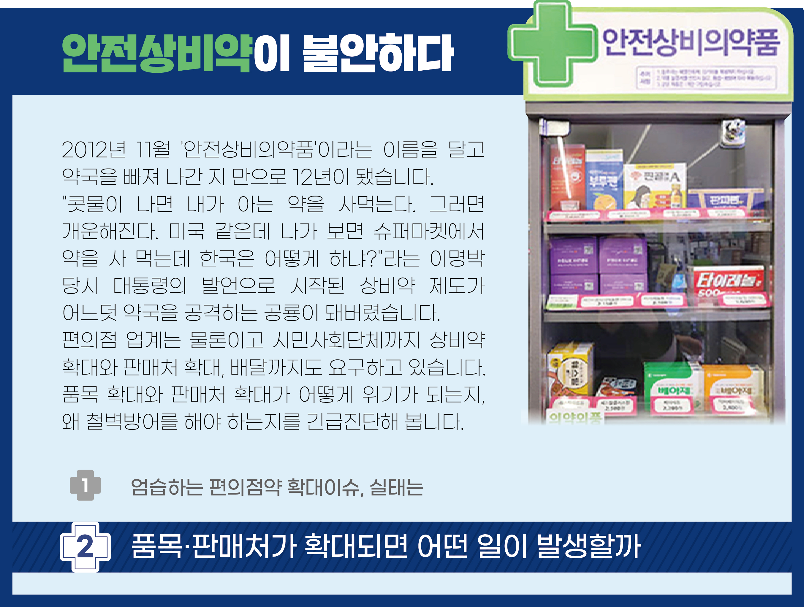 [4] 데일리팜 - [데일리팜] 안전상비약 판매자 등록기준 완화?...국민의견 수렴 (https://www.dailypharm.com/News/321468)