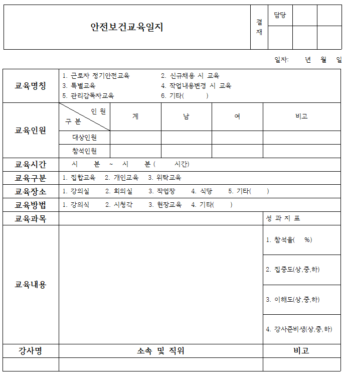 - 교육훈련 기록서 : 교육에 참여한 인원 및 교육의 내용을 기록합니다.