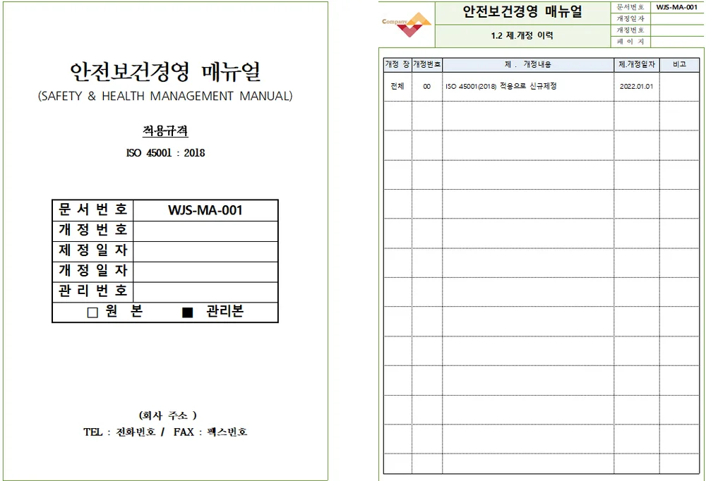 ISO 45001 인증을 위한 안전보건 매뉴얼은 조직 내 안전 및 건강 관리의 기본 지침을 제공합니다.