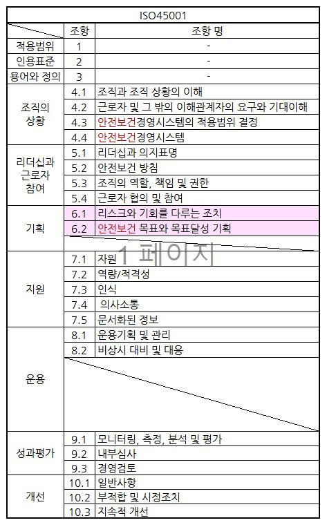 마지막으로 ISO45001에 따른 구체적인 요구사항을 정리한 표도 있습니다.