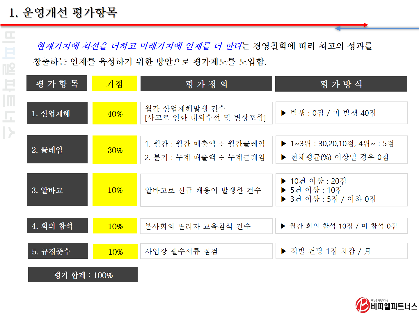 관리자 월간회의 참석(10%) / 사규준수(10%)