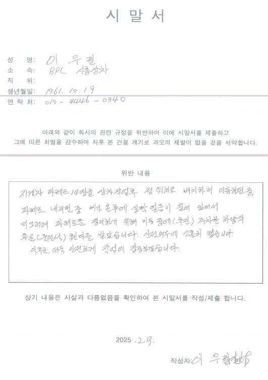 이후 작업간 지게차 안전사고 시 , 각 SUB 관리자는 재발방지대책을 수립하고 사고자 경위서 및 시말서를 첨부하여