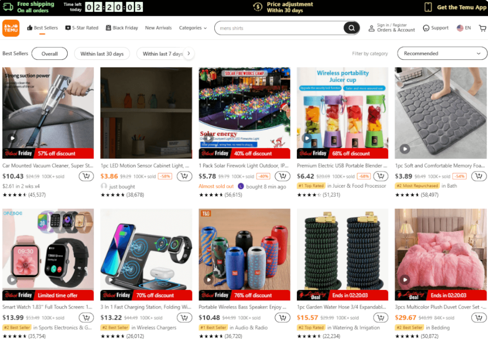 테무의 사업 모델은 주로 소셜 커머스에 기반하고 있습니다. 고객은 테무 플랫폼에서 다양한 상품을 구경하고 쉽게 구매할 수 있으며, 다양한 할인 및 프로모션이 제공됩니다. 예를 들어, 최근 블랙프라이데이를 기념하여 많은 인기 제품들이 할인된 가격에 판매되었습니다.