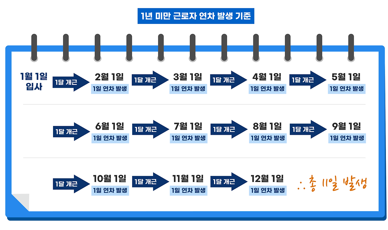 직장에 처음 입사하면 연차는 어떻게 생성될까요? 근로기준법에 따르면, 입사 후 1년 동안 80% 이상 출근한 근로자는 15일의 유급휴가를 받을 수 있습니다. 하지만 입사 첫 해에는 연차가 매달 1일씩 발생합니다. 예를 들어, 1월 1일에 입사한 경우, 1월에는 1일, 2월에는 1일, 이렇게 12개월 동안 총 11일의 연차가 발생하게 됩니다. 아래의 이미지를 통해 연차 발생 일정을 확인해 보세요.