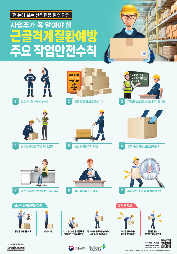 물류센터에서 근골격계 질환을 예방하기 위한 안전 수칙 포스터입니다.