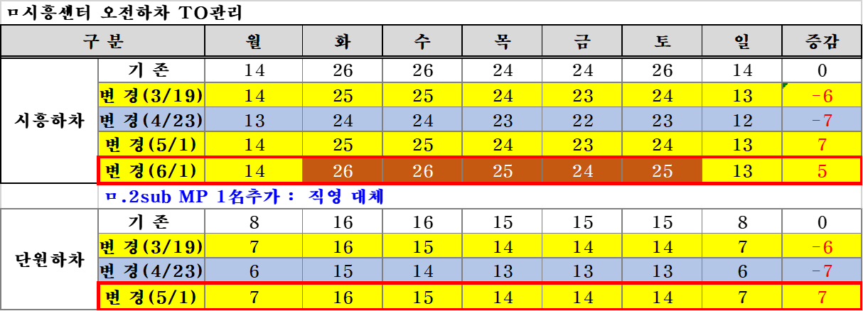 5월 오전 근태일지 https://youtube.com/shorts/xH_R9pdYhp0?feature=share ㅁ. 시흥 5/31 (토요) 인원 운영 계획 ㄴ. TO : 26名 (주마감: 2名)ㅁ. 단원 5/31 (토요) 인원 운영 계획 ㄴ. TO : 15名 (주마감: 1 名 ) 근태일지/주간 근태일지 2025.04.01