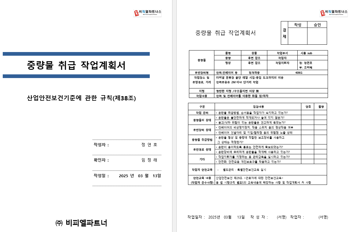 https://youtu.be/0WxaaYMa3Jw 물류센터에서 중량물 취급 작업계획서에 대해 알아보겠습니다. 중량물 취급은 물류센터의 핵심 작업 중 하나로, 안전하고 효율적인 작업을 위해서는 철저한 계획이 필요합니다. 이번 포스팅에서는 중량물 취급 작업계획서의 중요성과 작성 방법에 대해 자세히 설명드리겠습니다.중량물 취급 작업계획서란?중량물 취급 작업계획서는 중량물을 안전하게 취급하기 위해 필요한 모든 정보를 포함한 문서입니다. 이 계획서는 작업의 목적, 방법, 필요한 장비, 인원 배치, 안전 대책 등을 상세히 기술하여 작업의 효율성을 높이고 사고를 예방하는 데 중요한 역할을 합니다.중량물 취급의 중요성중량물 취급은 물류센터에서 자주 발생하는 작업으로, 잘못된 취급은 큰 사고로 이어질 수 있습니다. ..