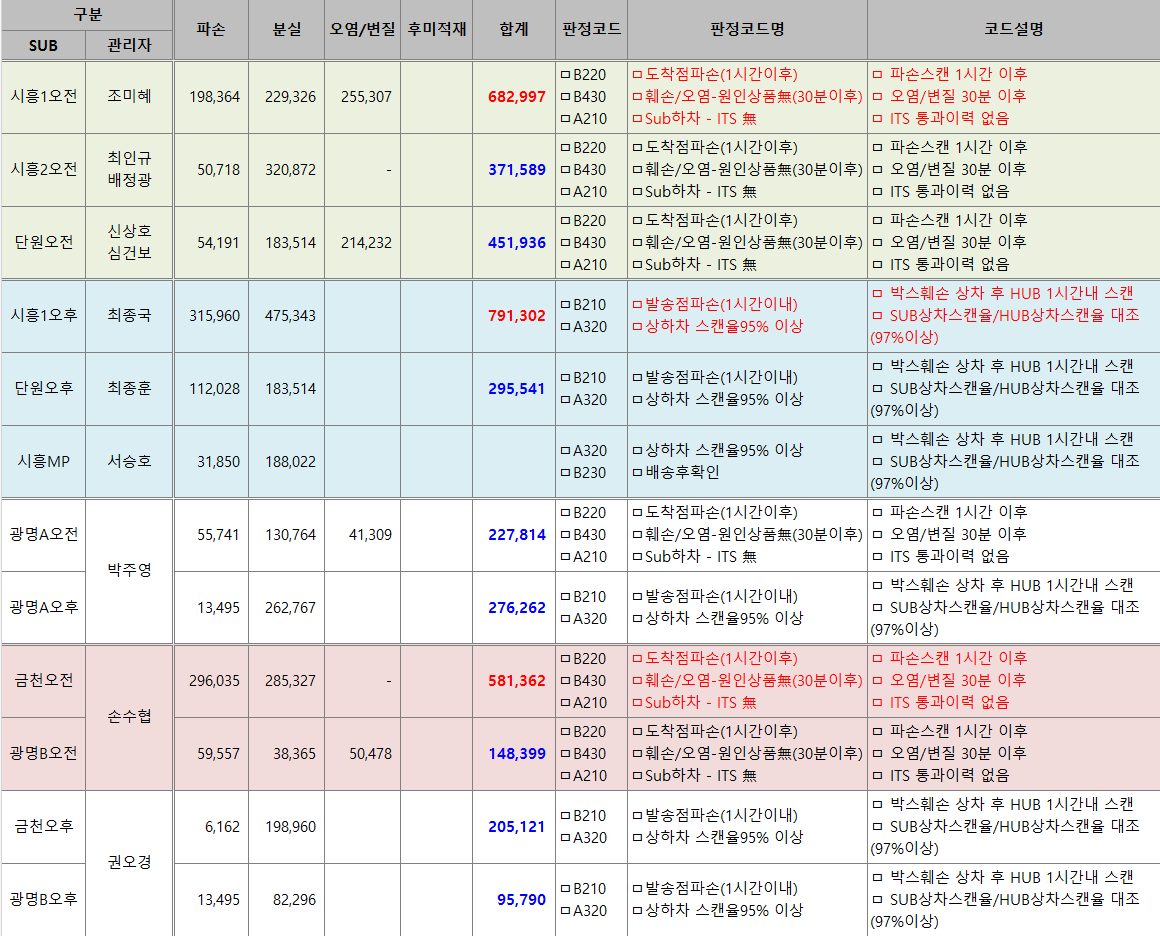 TR장이 사고내용 분석하여 글을 남기는 사유는 이런 사례에대해 재발 방지하자는 목적이니 , 과거를 답습하지 말고 동일한 사고를 발생하지 말자는 목적이니 게의치 마시고 회사 손익에 좀더 중점을 주고 업무방향을 변경토록 노력 합시다. 1등 SUB가 되기 위해서는 하차마감, 상차마감시간은 기본베이스이며, 타SUB와 다른 관리자 인식의 개선이 필요합니다. 우리는 손익관리가 1순위가 되어야되며, 회사는 이익이 남지 않으면 생존 이유가 없다는점 항상 인지하시기 바랍니다. 1. 신선식품 고객 도착 1일지연으로 변상요청 접수내용 ㄴ. 변상금액 : 약 12만원 ㄴ. 1일 배송 지연사유 : 원인불명 D+1일 중계 ㄴ. 개선대책 : 하차마감 전 (마감방송전) 현장 신선파손 확인 후 마감방송. 2. 시흥 간선상차..