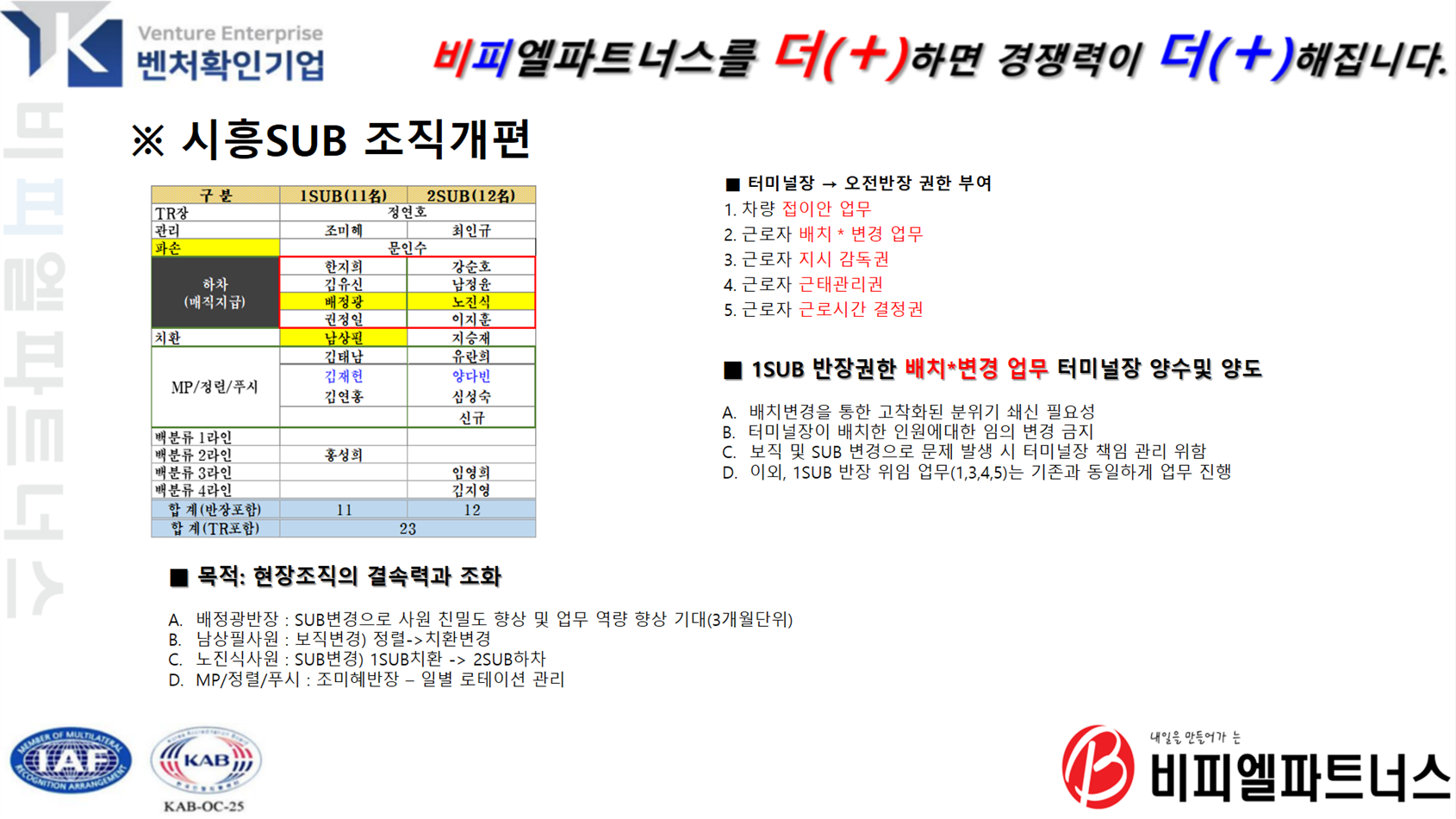 어려운 결정을 내려주신 최인규/배정광반장님께 감사드리며, 조미혜반장님은 1SUB MP/정렬/푸시인원에대한 결속력을 다져주시고 , 3명이서 로테이션을 돌려 멀티플레이어가 되도록 해주시기 바랍니다. 남상필사원님은 정렬에서 치환으로 변경하여 업무를 배울 예정이니 , 티알장 결정내용에대해 적응할 때까지 시간과 인내를 갖고 지켜봐주시기 바랍니다. 티알장이 위임한 반장 배치/변경업무를 일부 티알장이 양수하지만 현장이 안정되면 다시 위임할 예정입니다.